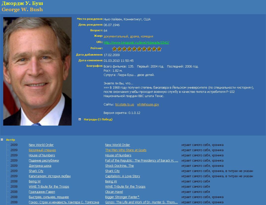 5 Tabs: Main information, Biography, Filmography Awards and Images. Standard fonts colors and positioning. It is also added Imagelist tab.